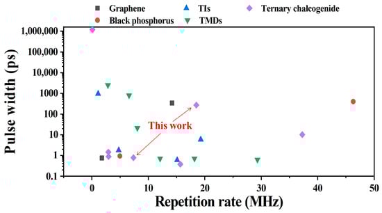 Table 2 presents an output performance comparison of ML fiber lasers based on various 2D material SAs, including graphene, BP, TIs, and TMDs. Figure 10 shows the corresponding pulse width and repetition rate. Notably, the pulse width in our results is approximately 85.6% shorter than those of other Ta2NiS5-SA fiber lasers. Figure 9d presents the radio frequency (RF) spectrum of ML pulses with a basic repetition rate of 7.36 MHz, consistent with the cavity length of 27.1 m. The SNR of the fundamental frequency was shown to be 70 dB, indicating a highly stable ML operation. The dependence between the average output power of the ML pulses and the pump power was measured, as shown in Figure 9e, with good linearity and a slope efficiency of 2.5%. The spectra were recorded every one hour. Figure 9f shows the optical spectral evolution of the pulse over 8 h, indicating the good stability of the ML EDF laser.