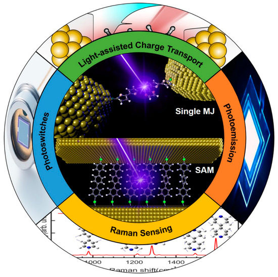 Thanks to the rapid development of experimental techniques in MJ fabrications and measurements, researchers are now able to expand their investigations beyond pure charge transport. Many interesting transport phenomena in MJs have been reported to date, including the transistor (or gating) effect [15,16,17,18], conductance switching [19,20,21], thermal [22,23], thermoelectricity [24,25], photoswitching [26,27,28] and spintronics [29,30,31,32,33]. While most of these topics have been previously reviewed [34,35,36], we, in this work, will focus our attention on the optoelectronic phenomena in MJs, a topic that has been rarely surveyed in detail yet is rather important for furthering the development of the field. Light-matter interactions in illuminated MJs have drawn increasing amounts of attention in recent years due to many exciting potential applications associated with them, such as photovoltaics [37,38], organic light-emitting diode [39,40,41], chemical/bio-detection [42,43,44,45], and plasmonics [46,47,48]. Light, as an external stimulus for MJs, has several advantages over other external stimuli owing to its remote access, ultra-fast response time, a wide range of choices in wavelengths (or energy), and noninvasiveness. In an illuminated MJ, new transport effects may emerge due to various interactions, including light-molecule interaction, light-metal electrode interaction, and light-induced variation of the local environment, such as heating, generation of surface plasmon, and high electric field [49]. These unique interactions have led to the observation of a variety of phenomena, such as increases in molecular conductance, generation of highly energetic hot-carriers, photoemission, and molecular structure variations [50,51,52,53]. It is therefore highly expected that developing experimental approaches to control these interactions in illuminated MJs are essential for the design and production of next-generation molecular-scale optoelectronic devices.