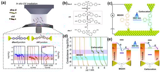 Photo-induced molecular structure change. Light illumination on photochromic molecules and their derivatives, like dihydroazulene and triphenylmethane leuco, is known to alter their structures [61,62,63,64]. Several recent works have shown that the conductance of molecular junctions based on these photochromic molecules can be changed accordingly upon light illumination. Huang et al. employed the MCBJ technique coupled with UV irradiation (365 nm) to study the photo-thermal reaction processes in a photochromic dihydroazulene(dha-6)/vinylheptafulvene(vhf) system (Figure 2a) [49]. In their study, they performed conductance measurements by UV irradiation and heating treatments. It was found that the conductance of the initial dha-6 junction dropped by more than one order of magnitude, which was attributed to the fact that the dha-6 molecule underwent a ring-opening process of the five-membered ring under UV irradiation. By applying a 60 °C heat treatment for 30 min, the vhf can fully switch back to dha-6 through a ring-closing process (Figure 2b). Their approach could be used for probing the reaction kinetics, reversibility, and the occurrence of isomerization during the chemical reaction in MJs. In another recent study, using the STM-BJ technique, Bei et al. demonstrated photo-induced carbocation-enhanced charge transport in an MJ composed of malachite green leuco hydroxide (MGOH) [65]. As shown in Figure 2c, in the presence of 302 nm UV light, the MGOH produces malachite green carbocations, thus inducing a minor structural change where the orbital hybridization of the central carbon atom changes from initial sp3 to sp2. This structural change resulted in a large enhancement in single-molecule conductance by a factor of 34 (Figure 2d). It was found that both narrowing of the HOMO-LUMO gap and the enhancement of the transmission close to the Fermi levels contributed to the photo-induced carbocation-enhanced charge transport in MGOH when the carbocation formed (Figure 2e).