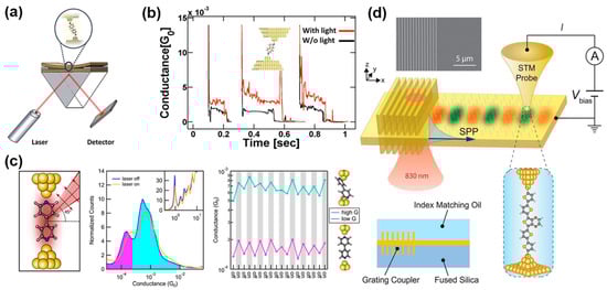 The ability to reliably switch the conductance of a single molecule between two or more distinct states is pivotal for the use of molecules as building blocks in future optoelectronics, computing, and chemical/bio-sensing applications. Conductance switching effects have been demonstrated in MJs exposed to various external stimuli, such as electric field [77,78,79], mechanical modulation [80], chemical [80], and optical means [81]. Here, we focus specifically on the conductance switching behavior in MJs driven by optical excitation.