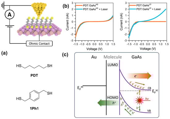 Noble metals have been widely used as contact electrode material for molecular junctions due to their ohmic contact electrical behavior, being insensitive to oxidation and tarnishing, and the availability of making large-scale devices [73,74,75]. However, for a metal-molecule-semiconductor (MMS) junction, the semiconducting electrodes may increase the functionalities of the MMS junction by displaying its rectifying behavior and the occurrence of spontaneous photocurrent. The optoelectronic behavior of MMS junctions has also been investigated recently. Employing the STM-BJ technique, Vezzoli et al. studied the Au-1,5-Pentanedithiol (PDT)-GaAs junction and Au-1,4-Phenylene- (dimethanethiol) (1Ph1)-GaAs junction under laser irradiation, respectively (Figure 5a) [76]. They found that junctions with lower doped GaAs gave high rectification ratios in the dark and a high photocurrent under reverse bias. In contrast, junctions with highly doped GaAs presented poor rectification in the dark and a low photocurrent (Figure 5b). This difference was attributed to the thicker depletion layer or space charge region in lower doped GaAs. The thicker layer served as a wider tunneling barrier which not only prevented electron transport from the metal to the lower doped GaAs when junction bias was lower than the Schottky breakdown voltage but also increased the number of electrons and holes generated in the conduction band and valence band of GaAs under laser illumination. Band bending at the MMS junction separated the photogenerated electrons and holes. The electric field in the space charge region pushed photogenerated holes to the molecule, while the photogenerated electrons were driven to the GaAs electrode. Thus, photocurrent is produced under reverse bias (Figure 5c). Furthermore, the radius of the hemispherical space charge region was enlarged as the reverse bias potential was increased. The fraction of the illuminated region that contributed charge carriers to the photocurrent also increased.