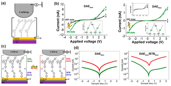(a) Schematic of a SiO2/Ti2 nm/Au45 nm/diarylethene (DAE)x nm/C-AFM tip MJ; x is the diarylethene oligomer layer thickness. (b) I-V characteristics before (black) and after (green) UV irradiation of the DAE3 nm (left panel) and DAE9 nm (right panel) junctions measured by C-AFM. The upper inset shows the zoom of the black curves. Lower insets show reversibility. Reprinted with permission from ref. [124]. Copyright 2020, American Chemical Society. (c) Schematic of a SiO2/Ti2 nm/Au45 nm/BTB/DAE/C-AFM tip MJ and the photoswitching of the diarylethene oligomer units between UV and visible light. (d) Current in log scale versus bias characteristics before (green) and after (red) UV irradiation of DAE9 nm (left panel) and DAE4 nm/BTB5 nm (right panel) junctions measured by C-AFM. Reprinted with permission from ref. [125]. Copyright 2021, American Chemical Society.