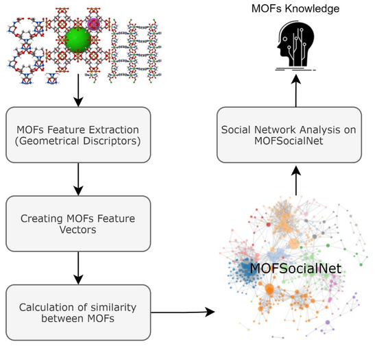 In this paper, we construct a social network called MOFSocialNet from geometrical descriptors of MOFs in the CoRE-MOFs database. MOFSocialNet is an undirected, weighted, and heterogeneous social network. Following the construction of MOFSocialNet, we provide a set of social network analytic processes to extract valuable knowledge from the MOF data using graph-mining algorithms. The full workflow of the MOFSocialNet is shown in Figure 1. In the first step, we created a feature vector for each MOF. In the following step, the similarity between each pair of MOF vectors is calculated based on vector similarity methods. In this step we created the MOFs social graph, named MOFSocialNet, where MOFs are the nodes and the similarity between the MOF feature vectors are the links (i.e., the relationships between MOFs). Finally, after removing irrelevant links in the graph, we applied social network analysis methods to extract valuable knowledge from this graph. In subsequent sections, all steps are described in detail.