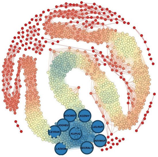 The closeness centrality captures the accessibility of network components. In the MOFSocialNet, being a network of MOF structures, closeness centrality can identify the most representative MOFs of a given dataset. Table 3 and Figure 5 illustrate the network, highlighting the ten MOFs with the highest closeness centrality.