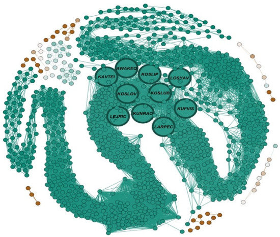 In MOFSocialNet, 24 communities were identified through the Lovain method. In Figure 6, we visualized the graphs of the 24 communities. To improve the readability of the graph, we removed the MOFs node labels. It should be noted that using the Gephi software, a further round of community detection was carried out on each of the 24 communities using the Louvain algorithm. The colors of the graph indicate the different communities. Thus, the nodes of the same color belong to the same community.