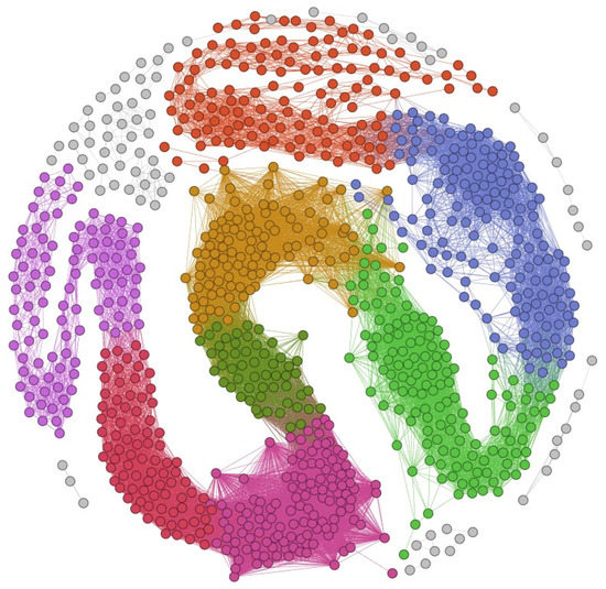 - Blondel, V.D.; Guillaume, J.-L.; Lambiotte, R.; Lefebvre, E. Fast unfolding of communities in large networks. J. Stat. Mech. 2008, 2008, P10008. [Google Scholar] [CrossRef] [Green Version]