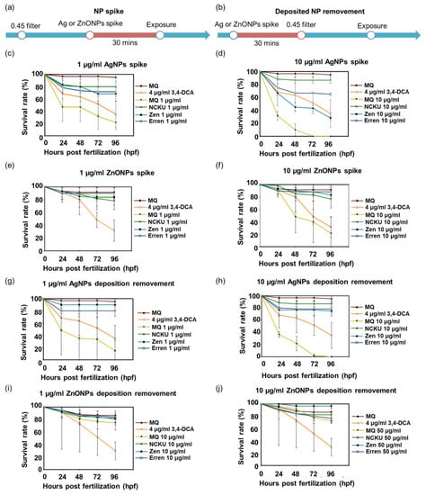 Lethality of AgNPs and ZnONPs spiked in natural water. The study design included two processes: (a) NP spiking and (b) deposited NP removal. The embryos were treated with (c) 1 µg/mL AgNPs, (d) 10 µg/mL AgNPs, (e) 1 µg/mL ZnONPs, and (f) 10 µg/mL ZnONP-spiked natural water. The mortality of embryos exposed to (g,h) 1 µg/mL and 10 µg/mL AgNP-spiked water, as well aI (i,j) 1 µg/mL and 10 µg/mL ZnONP-spiked natural water in which the aggregates were removed by a 0.45 μm filter. AgNPs, silver nanoparticles; ZnONPs, zinc oxide nanoparticles; 3,4-DCA, 3,4-dichloroaniline.