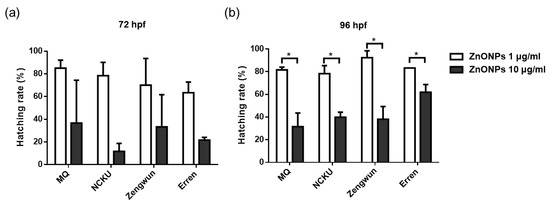 Developmental toxicity of ZnONPs. Hatching rate of zebrafish embryos exposed to ZnONPs. ZnONPs spiked in NCKU Lake, Zengwun Reservoir, and Erren River water. Hatching rate at (a) 72 hpf and (b) 96 hpf after exposure to different natural water samples. ZnONPs spiked in different water samples resulted in later hatching times in all groups. The significance between each different concentration groups were represented by * sign. (* p < 0.05). ZnONPs, zinc oxide nanoparticles; hpf, hours post-fertilization.