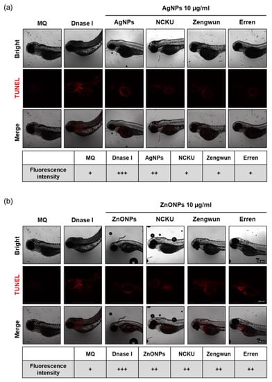 Whole-mount TUNEL staining was performed to evaluate apoptosis in zebrafish at 72 hpf. We washed the zebrafish with deionized water three times after exposure to Ag/ZnONPs. Zebrafish larvae were fixed with 4% paraformaldehyde for 1 h and then washed with PBS three times. Next, the embryos were incubated with blocking buffer on a shaker for 30 min and subsequently rinsed with PBS three times for 5 min. Then, the embryos were incubated with a permeabilization solution (0.1% Triton X-100 in 0.1% sodium citrate) for 30 min on ice and washed with PBS three times on a shaker for 5 min each. Finally, the TUNEL reaction mixture (labeling solution:enzyme solution = 9:1) was incubated with embryos in a water bath at 37 °C for 1 h, and we observed the embryos using a confocal fluorescence microscope (Nikon TE2000EPFS-C1-Si, Tokyo, Japan).