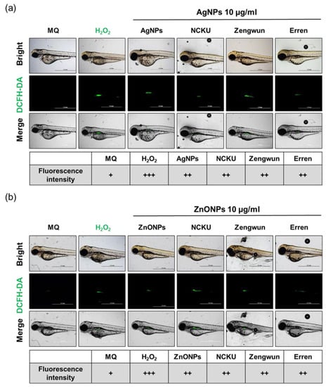 Dichlorodihydrofluorescein diacetate (DCFH-DA) (Sigma-Aldrich, St. Louis, MO, USA) was used to measure reactive oxygen species (ROS) levels in the zebrafish. The zebrafish embryos were exposed to AgNPs and ZnONPs solutions beginning at 4 hpf, and the DCFH-DA assay was conducted at 96 hpf. In the experimental procedure, we initially performed three washes with deionized water to remove solutions of AgNPs and ZnONPs and impurities from the surface of the zebrafish. Then, live samples were incubated with 5 μg/mL DCFH-DA at 28 °C for 1 h and coated with aluminum foil to protect them from light. After the incubation, the living fish were rinsed with deionized water three times. The embryos were fixed with 3% methyl cellulose to prevent movement, and images were captured immediately.