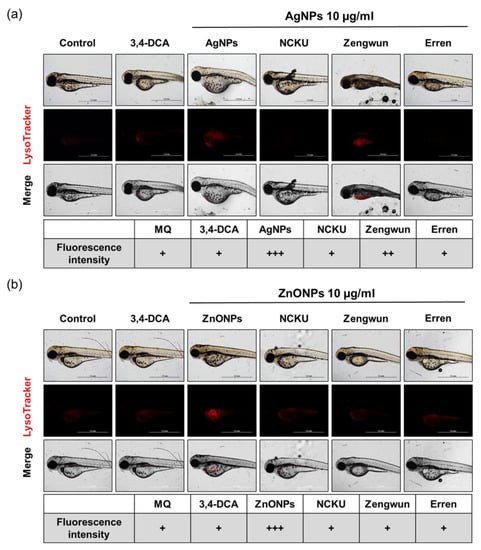 Autophagy induced by AgNPs and ZnONPs. Zebrafish embryos were exposed to natural water after passing through a 0.45 µm filter and then spiked with (a) AgNPs and (b) ZnONPs. After 72 hpf, zebrafish embryos were stained with LysoTracker RED. The fluorescence intensity was assigned as + (weak), ++ (middle), and +++ (strong). The 10 μg/mL MQ groups exhibited higher autophagy signals than groups treated with NPs spiked in natural water samples. AgNPs, silver nanoparticles; ZnONPs, zinc oxide nanoparticles; 3,4-DCA, 3,4-dichloroaniline; hpf, hours post-fertilization.