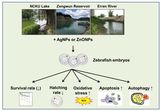 Our research confirmed that nanoparticles of AgNPs and ZnONPs spiked in NCKU Lake, Zengwun Reservoir, and Erren River cause minor toxic effects. We speculated that AgNPs and ZnONPs spiked in the natural water had a stronger aggregation and changed their physicochemical properties by interacting with the surrounding environment, which consequently mitigated their toxic effects. However, AgNPs and ZnONPs spiked in the natural water increased the mortality of zebrafish embryos and delayed hatching time in higher concentrations, as well as induced ROS, autophagy, and apoptosis.