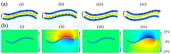 The COMSOL Multiphysics 5.6 software package was used to simulate the electrical distribution of the F-TENG during flutter deformation, as shown in Figure 1b. In the initial state, assuming that the surface of the PTFE carried a negative charge that was uniformly distributed, each of the two electrodes carried an equal amount of positive charge, and the total amount was equal to the negative charge mentioned above. As shown in Figure 1b(i), when the PTFE film is located at the center of the electrodes on both sides, the electric potential on the respective electrodes is equal, without any potential difference. When the lower electrodes of the PTFE film are close to each other (as shown in Figure 1b(ii)), a potential difference is induced between the lower and upper electrodes. As shown in Figure 1b(iv), the PTFE then moves in the upward direction until it contacts the upper electrode, generating an electromotive force opposite to that in Figure 1b(ii).