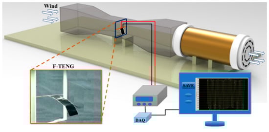 The experimental setup for testing the F-TENGs’ output performance in a low-speed wind tunnel is shown in Figure 3. The dimensions of the wind tunnel were 0.25 m (width) × 0.25 m (height) × 1 m (length), and the wind speed was varied between 2 m/s and 13 m/s using an inverter for speed control. A programmable electrometer (Keithley Model 6514, Cleveland, OH, USA) and Data Acquisition Board (NI DAQ, Shanghai Enai Instrument Co., Ltd., Shanghai, China) were used to realize the measurement and acquire the experimental data. A 3D printed structure was used to fix an F-TENG inside the wind tunnel. The position of the F-TENG could be changed in subsequent experiments.