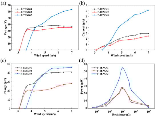 Variation of output of F-TENG#1, #2, and #3 with increasing wind speed: (a) voltage output of F-TENGs with different pre-grinding; (b) current output of F-TENGs with different pre-grinding; (c) charge output of F-TENGs with different pre-grinding; and (d) power output of F-TENGs with different pre-grinding.