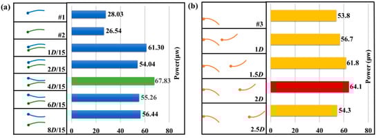 In the vertical parallel mode experiments, F-TENGs #1 and #2 with similar performance outputs were selected and placed in the vertical parallel mode. The vertical distance between the two flagpoles (eP) was adjusted to 1D/15, 2D/15, 4D/15, 6D/15, and 8D/15, owing to the limitation of the wind tunnel size, the maximum value that could be obtained for eP was 8D/15. The power output characteristics at different values of eP were measured at a wind speed of 7.2 m/s. The contrast diagram of the maximum total output power when F-TENG #1 and #2 were connected to the circuit in series is shown in Figure 6a. When the interval eP = 1D/15, the swing phases of the two flags were identical, and the total output power was low. When eP = 2D/15, the swing phases of the two flags were chaotic, and the output was unstable, indicating that the configuration lay in the zone between phase coherence and anti-phase coherence. When eP ≥ 4D/15, the swing phases of the two flutter flags were opposite. When eP = 4D/15, the maximum output power of the array with two F-TENGs was achieved at 67.8 μW, whereas the power density per unit area was 6.03 mW/m2. The analysis indicated that the two flags fluttered in the opposite phase and were close to each other, which increased the triboelectric strength and contact area between the PTFE films and the electrodes, thus increasing the output of the F-TENGs. With an increase in the distance between the two flags, the contact area decreased, and the maximum output power decreased and tended to stabilize.