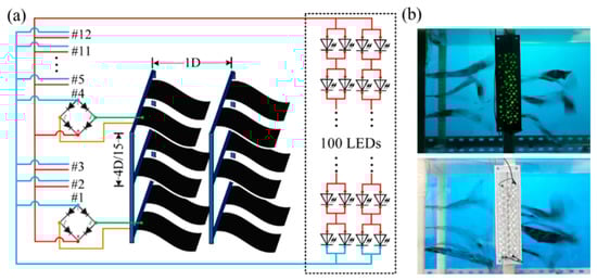 Based on the aforementioned results, we arranged twelve F-TENGs to form a power generation network, as shown in Figure 7a. In this array, the distance eT was fixed at 1D. By adjusting the vertical distance eP in each group, the performance of the power generation network was measured; limited by the size of the wind tunnel, when three rows of F-TENGs were arranged in a vertically parallel mode, the maximum possible vertical distance eP was 6D/15. A circuit was designed for wind energy harvesting with an array of LEDs as the power output. The 2 electrodes of an F-TENG were sequentially connected to a rectifier to provide a direct current output, and 12 F-TENGs were connected in multiple modes to a power load composed of 100 LEDs. By setting the wind speed equal to 8.0 m/s in the wind tunnel, 100 LEDs are efficiently lit by the 12 F-TENGs arranged at separations of 4D/15 in the vertical direction and at separations of 1D in the horizontal direction, as shown in Figure 7a,b.