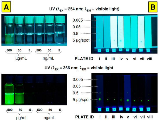 General view of LumidotTM CdSe/ZnS quantum dots solutions ((A); left column) and QDs spots on TLC plates ((B); right column) under different UV light conditions. Chromatographic stationary phases (plates) IDs: (i) Cellulose TLC, (ii) RP-18 W HPTLC, (iii) RP-18 W F254S HPTLC, (iv) RP-18 F254 S HPTLC, (v) Polyamide 11 F254 TLC, (vi) Silica gel 60 F254 TLC, (vii) Silica gel 60 W F254 S TLC, (viii) Aluminium oxide 60 F254 Type E TLC. Digital Camera settings for QDs vials: F = 8.0, shutter speed = 5 s, ISO 64.