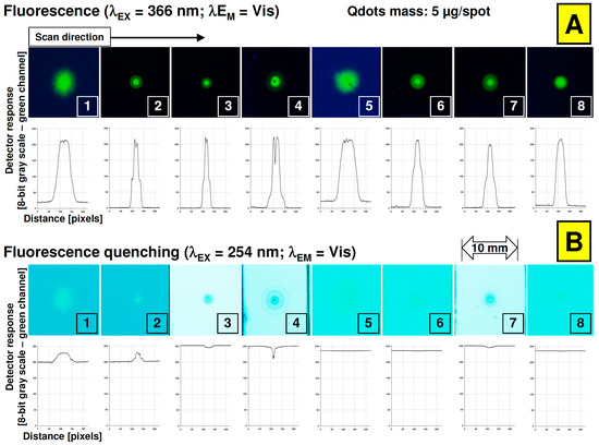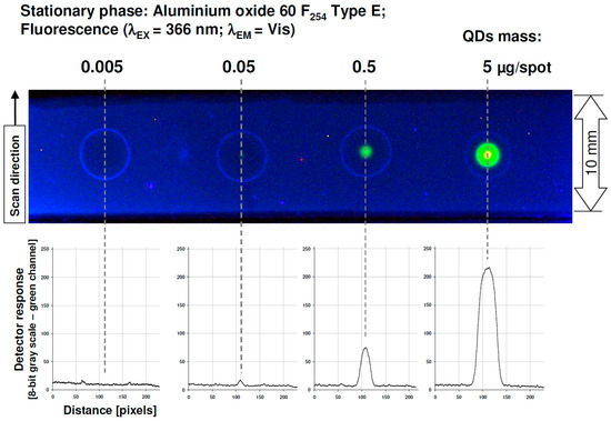 From a practical point of view, the densitometric profiles of the pictures and spots presented in Figure 3A strongly indicate that applying a relatively low amount of quantum dots enables forming an efficient photoluminescent zone for the detection of target components on various planar chromatographic plates. Nevertheless, the investigated LumidotTM CdSe/ZnS quantum dots did not affect the quenching mode in the case of 254 nm excitation wavelength (Figure 3B).