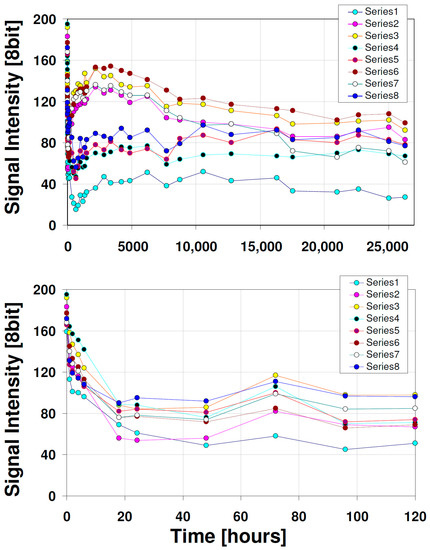 The main question raised in this study was to recognize the real stability of quantum dots fluorescence signal on the planar chromatographic stationary phases over time. Therefore, the planar chromatographic plates array was photographed over a long period of time. The results of this experiment are presented in form of graphs in Figure 4. The top graph represents the recorded profiles of the signal intensity for all planar chromatographic stationary phases within three years. The bottom graph covers the initial recording time within the first 120 h (5 days). As can be seen, the signal from QDs is unstable and strongly non-linear. Particularly, a massive signal deterioration is observed within the first few hours of the experiment, for which the exponential decay pattern can be considered (this is presented in Figure 5). Then, depending on the stationary phase composition, the signal starts to increase. This phenomenon begins after two days for QDs that were transferred to cellulose plate and after 28 days for RP-18 W HPTLC plate. Within the last two years, the fluorescence signal is going to stabilize or decrease slightly.