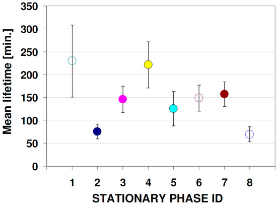 Mean lifetime values based on non-linear curve fitting (exponential decay with offset model: y = y0 + A1 e−(x − x0)t1) calculated for a 366-nm fluorescence signal within first 7200 min (120 h). Chromatographic stationary phases (plates) series IDs: (1) Cellulose TLC, (2) RP-18 W HPTLC, (3) RP-18 W F254S HPTLC, (4) RP-18 F254 S HPTLC, (5) Polyamide 11 F254 TLC, (6) Silica gel 60 F254 TLC, (7) Silica gel 60 W F254 S TLC, (8) Aluminium oxide 60 F254 Type E TLC.