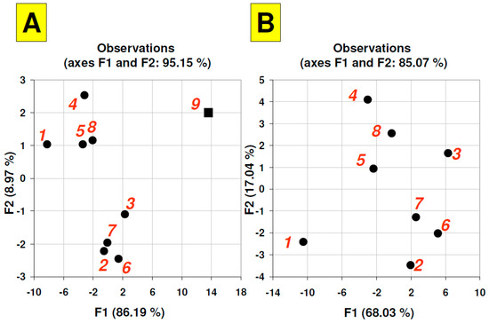 Principal component analysis—factor scores plots—related to fluorescence intensity (objects)/time (variables) matrix with (A) and without (B) fluorescence reference point (labelled as a black square). Chromatographic stationary phases (plates) series IDs: (1) Cellulose TLC, (2) RP-18 W HPTLC, (3) RP-18 W F254S HPTLC, (4) RP-18 F254 S HPTLC, (5) Polyamide 11 F254 TLC, (6) Silica gel 60 F254 TLC, (7) Silica gel 60 W F254 S TLC, (8),Aluminium oxide 60 F254 Type E TLC, reference area (9).