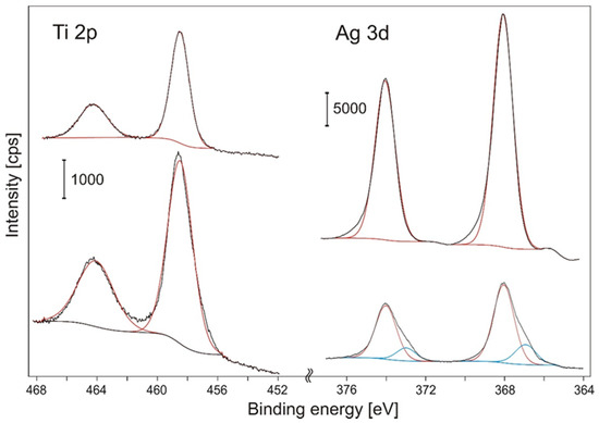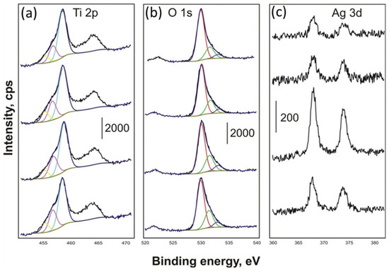 The surface composition of the samples, chemical states, and electronic states of the elements was inspected by XPS using Kratos ESCA 3400 furnished with a polychromatic Mg X-ray source of Mg Kα radiation (energy: 1253.4 eV). The base pressure was kept at 5.0 × 10−7 Pa. The spectra were fitted using a Gaussian–Lorentzian line shape, Shirley background subtraction, and a damped non-linear least square procedure. Spectra were taken over Ti 2p, O 1 s, C 1 s, and Ag 3d regions. The samples were sputtered with Ar+ ions at 1 kV with a current of 10 µA for 60 s to remove superficial layers. Spectra were calibrated to C 1 s line centered at 284.8 eV.