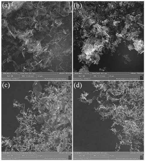 The morphology of annealed precursor Ag_TiO_LYO was observed by SEM, and the results for Ag_TiO_LYO/500, Ag_TiO_LYO/650, Ag_TiO_LYO/800, and Ag_TiO_LYO/950 are presented in Figure 2a–d. The annealing process led to the formation of network-like joined nanosheets, which are distinguishable by their shape and size [36]. SEM observation shows that crystallization took place only in the 2D direction, and 2D nanosheets with different degrees of crystallinity were acquired. Even at 950 °C, when the anatase–rutile transformation took place, the 2D nanosheet morphology did not collapse, and its morphology was preserved (Figure 2d).