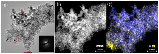 STEM images of (a) non-annealed precursor Ag_TiO_LYO and electron diffraction (inset); (b) HAADF Z-contrast image; (c) chemical distribution mapping of Ag and Ti.