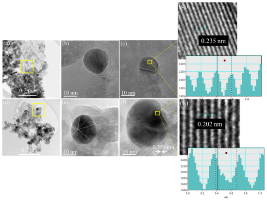 It is worth noting that the cubic Ag(0) NP structure was preserved; indeed, there was an evolution in particle shape from a spheroid to a spherical morphology during annealing at 650 °C. Ag(0) NPs oriented along their five-fold decahedral symmetry with five merged subunits (Figure 4e) were tightly attached on the surface of well-crystallized TiO2 (Figure 4e). Indeed, the measured d(101) = 0.358 nm was attributed to tetragonal anatase with space group I41/amd (see Figure 4f) and PDF JCPDS 21-1272. Figure 4f1 shows the HRTEM image obtained by DigitalMicrograph analysis (provided from the area highlighted in yellow in Figure 4f), suggesting a lattice spacing of 0.202 nm, corresponding to the (101) lattice planes of cubic Ag(0). Additionally, the uniform d-spacing along different ⟨100⟩ directions is consistent with the face-centered cubic (fcc) phase of metallic Ag(0) NPs, confirming that our observations are in line with the statement that the fivefold twinning phenomenon is very common for metal Ag [42,43,44]. Additionally, the HRTEM findings corroborated the observed XRD patterns of Ag_TiO_LYO/500 and Ag_TiO_LYO/650 (see Table 1 and Figure S2).