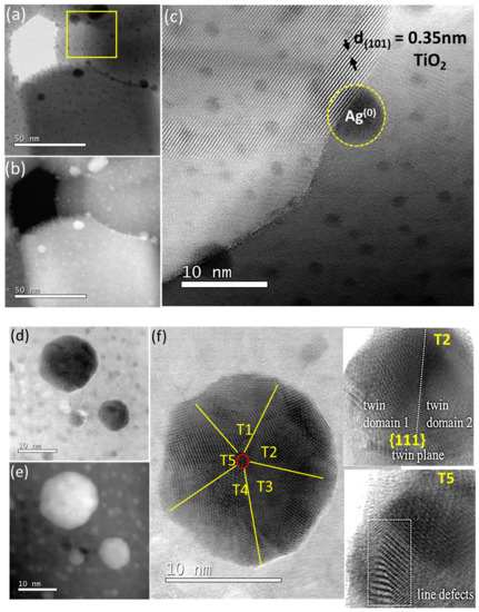 Figure 5f also includes subunit T5, where the SF implies the dislocation lines, observed as a result of TB interaction. The HAADF-STEM examination confirmed that higher temperature was able to facilitate the progressive coalescence of two Ag(0)NPs into one larger Ag(0)NP with a fivefold twinned structure [49]. Additionally, we could suggest that the perfect anatase TiO2(101) may provide nucleation sites for the growth of Ag(0)NPs with a pentagonal bipyramidal structure (Figure 5c), which, unlike Ag(0)NPs with a planar (flat) geometry in Ag_TiO_LYO)/500 (Figure 5a–c), could support the improvement of the properties of Ag_TiO_LYO)/800 as a photocatalyst [50]. The STEM image of Ag_TiO_LYO/950 with corresponding SAED (Figure S3) confirms single rutile nanocrystals with a size larger than 200 nm, which is in line with the XRD results (Table 1).