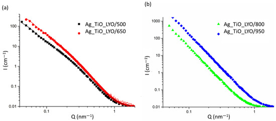 SANS curves with a fitted model for (a) the Ag_TiO_LYO/500 and Ag_TiO_LYO/650 samples, and (b) the Ag_TiO_LYO/800 and Ag_TiO_LYO/950 samples.