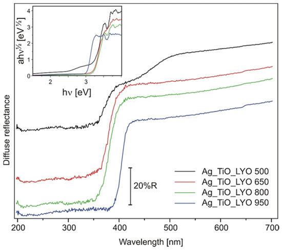 The diffuse reflectance spectra of samples annealed at 650–900 °C consist of a flat, highly reflective region at long wavelengths that abruptly transforms into a steeply falling reflectance edge at shorter wavelengths. On the other hand, the sample annealed at 500 °C exhibited reflection spectra with two maxima, due to its low crystallinity, numerous defects, and the presence of carbon impurities. The diffuse reflectance spectra were transformed to a Tauc plot (Figure 7, inset), proving an indirect allowed transition in the prepared materials annealed at temperatures 650 °C and higher. Samples Ag_TiO_LYO/650 and 800 possessed band gaps at 3.23 eV, which is typical for an anatase structure, but the higher-temperature sample (Ag_TiO_LYO/800) had a much higher silver surface concentration, which explains it’s having the highest photocatalytic activity. A bandgap of about 3.01 eV was observed in the Ag_TiO_LYO/950 sample due to transformation to rutile, known for lower photocatalytic activity.