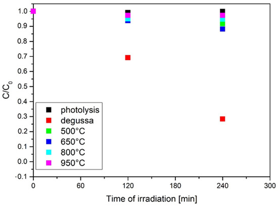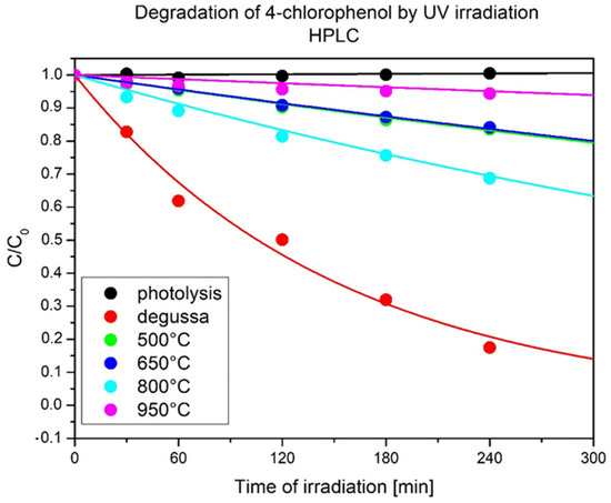 The prepared photocatalysts (0.15 g L−1) were added in an aqueous 4-chlorophenol solution (4-CP, 1.0 × 10−4 mol L−1). The reactant mixtures were irradiated under identical conditions in a photoreactor equipped with 10 lamps (Sylvania Blacklight 8 watt, λmax = 368 nm, intensity 6.24 mW cm−2). The volume of the reactant mixture was 175 mL. The photocatalytic activity of the samples was monitored by measuring the concentration of 4-CP in water (HPLC, Agilent Technologies 1200 Series, column LiChrospher RP-18, 5 μm, mobile phase mixture of methanol and water, UV-Vis absorption detection) as well as the total organic carbon (TOC-LCPH, Shimadzu, Kyoto, Japan). The instrumental method employs the incineration of the sample at 680 °C, resulting in the formation of CO2. Inorganic carbon presented as carbonate is transformed with 0.1% HCl to CO2. Formed CO2 was detected by implementing IR absorption spectroscopy. Water samples (20 mL) were taken periodically at 60, 120, and 240 min of irradiation.