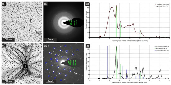 TEM observations of NSTFs prepared by laser ablation: (a–c) Ag _TiO2_AP; and (d–f) Ag_TiO2_500. (a) Low—magnification image of Ag _TiO2_AP; (b) SAED pattern of Ag _TiO2_AP; (c) interpretation of (b) showing amorphous TiO2 film decorated with nanoparticles of cubic Ag (green arcs and green marks); (d) low—magnification image of Ag_TiO2_500; (e) SAED pattern of Ag_TiO2_500; (f) interpretation of (e) showing the crystalline anatase film (spots in blue circles and blue marks) decorated with nanoparticles of cubic Ag (green arcs and green marks).