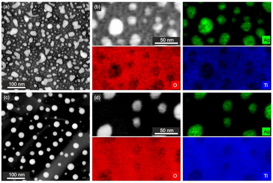 STEM/HAADF/EDX observations of NSTFs prepared by laser ablation: (a,b) Ag _TiO2_AP; (c,d) Ag_TiO2_500. (a) Low-magnification image of Ag _TiO2_AP; (b) EDX elemental mapping Ag _TiO2_AP; (c) low-magnification image of Ag_TiO2_500; (d) EDX elemental mapping Ag _TiO2_500.