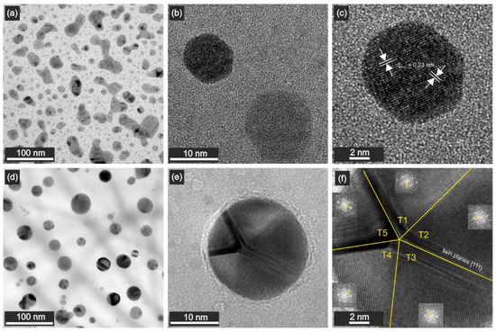 A detailed understanding of the Ag_TiO2_500 NSTF growth and morphology was further investigated by HRTEM analysis (Figure 12). The high-magnification HRTEM image in Figure 12b corresponds to Ag _TiO2_AP, in which Ag single-crystal NPs with quasi-spherical shape and an average particle size close to 20 nm can be easily recognized. Figure 12d–f shows the results for Ag_TiO2_500. Upon annealing at 500 °C, the original Ag NPs were completely rearranged into spherical NPs. In addition, these spherical NPs were very often composed of the intergrowth of multiple individuals with twinning planes {111}. The most common was the well-known pentagonal intergrowth, with a common zone axis [110] for all the individuals [42,43,44]. The formation of such NPs could be the result of the “dissolution–recrystallization” process of Ag agglomerates formed by the gathering of smaller quasi-spherical Ag NPs upon annealing. This is further supported by the determination of particle size redistribution by the ImageJ software (Figure S7). The obtained results indicate that annealing at 500 °C yielded significantly different particle size distributions for Ag_TiO2_500 than for Ag_TiO2_AP. These different particle sizes may represent the mass balance between the constituent element (crystallization of anatase from amorphous TiO2), and the formation of smaller, more stable spherical Ag NPs. Therefore, it can be concluded that the annealing process can modify the entire morphology of Ag _TiO2_AP.