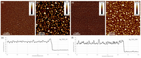 The surface topography of Ag_TiO2_AP and Ag_TiO2_500 NSTFs was studied by AFM (Figure 13). It was observed that continuous and uniform films were produced without a visible change in topography. From the surface profile plots measured along the horizontal lines in the AFM images, it can be seen that annealing led to an increase in roughness and to a small increase in thickness from 40 to 43 nm in Ag_TiO2_500 (Figure 13c,f). The different color of the NPs reflects their different height, suggesting the formation of agglomerates upon annealing. Analysis of the magnified images reveals the size distribution of the NPs, with a lateral size of 18–19 nm for the Ag_TiO2_AP NSTF. Larger agglomerates with sizes of 26–27 nm appeared on the Ag_TiO2_500 NSTFs surface. The thickness was measured at the sharp edge of the film, which was produced by applying a mask on the substrate during the deposition. The thickness was about 40 and 43 nm for Ag_TiO2_AP and Ag_TiO2_500 NSTFs, respectively. The higher spatial density of the agglomerations in Ag_TiO2_500 NSTF and the shift of the size distribution towards a larger NP size were further supported by ImageJ software estimation (Figure S6).