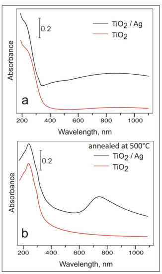 The UV-Vis spectra of the Ag_TiO2_AP (Figure 14a) and Ag_TiO2_500 (Figure 14b) TNSFs were measured on the quartz substrates using the transmission technique in a range of 190–1100 nm. The undoped TiO₂ layer showed high absorption at 330 nm. The film with deposited Ag(0)NPs showed a shoulder at 320 nm that can be regarded as interfacial charge transfer absorption and a very broad bump above 350 nm. The broad feature had a flat maximum centered at about 850 nm, which can be attributed to localized plasmon resonance (LSPR) absorption. As the LSPR is tunable and strongly dependent on the morphology (shape and size), composition, and interaction between Ag(0) NPs and the substrate, the broad feature was regarded to be a result of size distribution. Both of these absorptions could be considered to have the potential to improve the photocatalytic properties of the Ag_TiO2 NSTFs. Indeed, in Ag_TiO2_AP TNSF, the TiO2 layer showed an intensity maximum in the UV spectrum due to partial crystallization, while Ag_TiO2_500 TNSF demonstrated intense LSPR at about 730 nm. The absorption band was narrowed because annealed NPs are spherical and have a narrow diameter distribution, as proved by STEM and ImageJ analysis (Figure S6). The band, connected to interfacial charge transfer, observed in Ag_TiO2_AP vanished due to the small contact area between Ag NPs and anatase TiO2.
