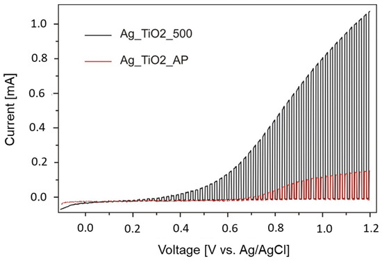 Photoelectrochemical measurements were conducted with deposits on FTO glass substrates. Cyclic voltammetry was studied between bias potentials of −0.5 and +1.5 V with a Pt counter electrode and an Ag/AgCl reference electrode in 0.5 M H₂SO₄ as an electrolyte. Under irradiation by visible light (100 W solar lamp), hydrogen generation on Pt and oxygen generation on working electrodes were visible, and the gas products were confirmed by mass spectrometry. Above 1.2 V, rapid degradation of the Ag_TiO2 samples was observed, and further LSV measurements were conducted under this potential (Figure 16) with fresh electrodes. The corresponding photocurrent–potential relationships were tested under illumination and in the dark at a low scan rate (1 mV/s). Both as-prepared and annealed samples exhibited an anode current when exposed to light compared to experiments performed in the dark. The photocurrent performance of the Ag_TiO2_500 photoanode started at 0.23 V vs. Ag/AgCl, which corresponded to the water oxidation potential. A much higher photochemical activity was observed in the annealed Ag_TiO2_500 TNSF sample, as was expected due to the intense (LSPR) optical absorption and better crystallinity, which are two important factors in improved PEC performance in TiO2 materials.