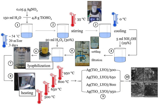 In a typical experiment (see Scheme 1 and Figure S1), 4.80 g of titanyl sulfate (TiOSO4) was dissolved in 150 mL of distilled water at 35 °C (step 1). Then, 0.05 g of AgNO3 solution was added, yielding a calculated value of 3 wt. % of silver to give a colorless solution. This solution was cooled for approximately 1 h in the freezer, and thereafter the precipitation was carried out at ~0 °C in aqueous ammonia until the pH reached 8. The precipitate was filtered and washed several times to remove sulfate anions formed during the reaction. The precipitate as obtained was transferred into a beaker and resuspended into 350 mL of distilled water. The pH of the resulting suspension was reduced by adding 20 mL of 30% hydrogen peroxide (H2O2), and it was stirred at ambient temperature until the solution turned from turbid yellowish to transparent yellow. The PPTA solution was added dropwise into Petri dishes immersed in liquid nitrogen (LN2) (step 5). Frozen droplets were immediately lyophilized at 10 mTorr, at −54 °C for 48 h by using VirTis Benchtop K, Core Palmer UK lyophilizer (step 6). After lyophilization, a yellowish lyophilized precursor (lyophilized foam-like cake) was isolated (step 7) [25,26,27,28]. The lyophilized precursor labeled Ti_Ag_LYO was further heat-treated under air at 500, 650, 800 and 950 °C for 1 h in each case (with rate 3 °C/min), and four new samples denoted as Ag_TiO_LYO/500, Ag_TiO_LYO/650, Ag_TiO_LYO/800 and Ag_TiO_LYO/950 were isolated (see Figure S1/Scheme 1).