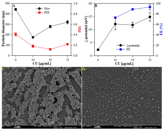 Fabrication of stable and homogeneous CUHNP. Particle size, PDI (A), ζ-potential, and encapsulation efficiency (B) of CUHNP as a function of CU concentration and SEM images of HSA (C) and CUHNP (D) nanoparticles.