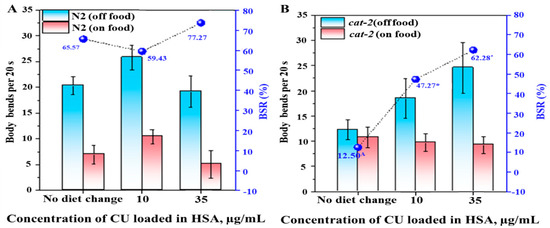 On the other hand, cat-2 mutants have a defective DA biosynthetic process due to the lack of ortholog in the human tyrosine hydroxylase (TH) gene. This disables the ability of cat-2 mutants to recognize new surroundings and does not reduce their movement speed as if they are still in space without food. The control group of the cat-2 mutants (without exposure to CUHNP) displayed a very low BSR of ~12.5%. The low BSR percentage was rescued after the cat-2 worms were exposed to 10 µg/mL and 35-µg/mL CUHNP, displaying a significant reduction (p < 0.01) in their movement speed in the new plate containing food, resulting in ≈50–60% BSR. The change in the BSR percentage was more pronounced in the animals fed with 35-µg/mL CUHNP, and this is almost similar to the case of the wild-type N2 strain (Figure 3B). These results demonstrate that CU delivery can be successfully attained by employing an HSA nanoparticle vehicle. The results from the cat-2 experiments claim that the CUHNP can be orally administered to turn on alternative DA-like neurotransmitter synthesis or to enhance the efficiency of DA transmission.