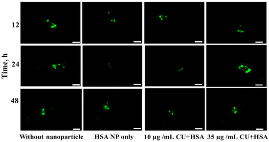 Protection of DA neurons against neurodegeneration. Fluorescence images of anterior DA neurons of BZ555 [dat-1::gfp] C. elegans strain fed with and without CU-loaded HSA nanoparticles (CUHNP) at 12 h, 24 h, and 48 h of adulthood, respectively. Scale bar: 50 µm.
