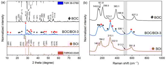 (a) XRD patterns and (b) Raman spectra of BOC, BOI, and BOC/BOI-3 heterostructure photocatalysts.
