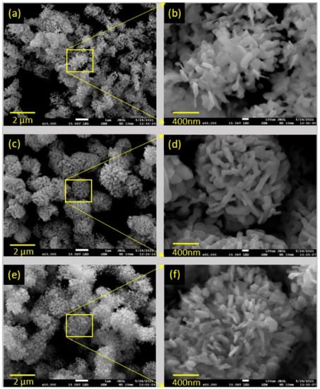 To investigate the morphology and microstructure of the synthesized samples, FESEM and TEM measurements were performed. Figure 2 shows SEM images of the BOC, BOI, and BOC/BOI-3 samples. The morphology of BOC was observed to be irregularly agglomerated nanoparticles of about 80 nm in size (Figure 2a,b). By contrast, SEM images of the BOI show micro-spherical structures composed of elongated nanoparticles with an approximate thickness of 100 nm (Figure 2c,d). In comparison, the SEM images of BOC/BOI-3 show micro-spherical structures composed of nano-platelets with an average thickness of 50 nm (Figure 2e,f). The nano-platelets of the BOC/BOI-3 are thinner than those of BOC and BOI.