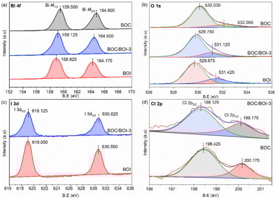 Moreover, the elemental compositions of BOC, BOI and BOC/BOI-3 were further investigated using XPS. The survey XPS spectrum of the BOC/BOI-3 composite shows the presence of O 1s, I 3d, Cl 2p, and Bi 4f peaks, thus confirming the existence of BOI and BOC in the composite (Figure S5). Meanwhile, the C1s peak observed at 284.800 eV originates from the carbon tape used as a substrate for XPS measurements [40,41]. The Bi 4f XPS spectra of all samples exhibit the typical peaks of Bi 4f5/2 and Bi 4f7/2, which are attributed to the Bi-O bonding (Figure 4a). Both peaks of BOC/BOI shift to lower binding energies (0.300 eV and 0.425 eV) than BOC and higher binding energies (0.325 eV and 0.200 eV) than BOI. The O 1 s spectra of each sample were deconvoluted into two peaks, as shown in Figure 4b. The main peak at the lower binding energy and the satellite peak at the higher binding energy originate from Bi-O and adsorbed oxygen, respectively [42]. In particular, the position of the main peak in BOC/BOI is lower than that in BOC and higher than that in BOI [43], which is similar to the tendency of the Bi 4f spectra. We also compared the I 3d spectrum of BOI and the Cl 2p spectrum of BOC with the BOC/BOI composite, as depicted in Figure 4c,d. Figure 4c shows the I 3d spectra of the BOI and BOC/BOI-3 samples [44]. It can be seen that a more oxygenated environment was generated in the form of composite. Therefore, the position of both the I 3d1/2 and I 3d5/2 peaks in the composite were shifted by 0.075 eV toward a higher binding energy than BOI. The blue shift may result from a more oxygenated environment in the composite. In the Cl 2p spectrum in Figure 4d, the deconvoluted Cl 2p1/2 and Cl 2p3/2 peaks of the Cl 2p peak in the composite were also shifted by 0.300 eV and 1.000 eV toward a lower binding energy than BOC, respectively.