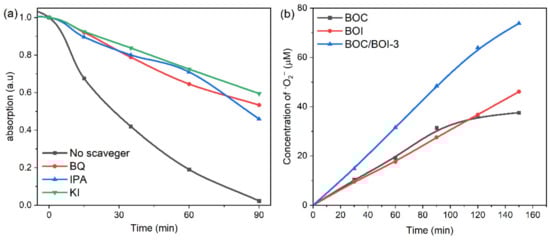 (a) Radical trapping experiments during degradation of RhB over BOC/BOI-3, (b) time-dependent concentration plots of the amount of •O2− radicals.
