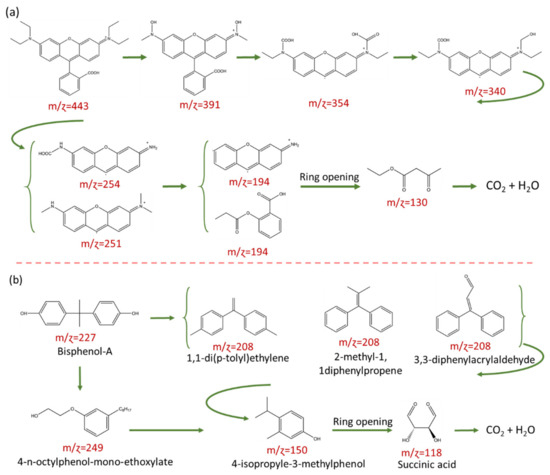 Photocatalytic degradation pathway and possible reaction intermediates in (a) RhB and (b) BPA over BOC/BOI-3.