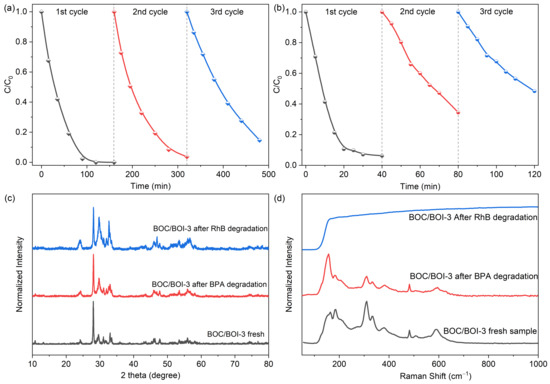 We further conducted the recycling experiments to evaluate the photocatlytic reusability and stability of BOC/BOI-3 heterojunction photocatalyst, as illustrated in Figure 8. It can be seen that BOC/BOI-3 provides 100% RhB degradation efficiency (Figure 8a) and 95% BPA degradation efficiency (Figure 8b) after the first cycle, while a subsequent decrease in catalytic activity is observed after the second and third run. After the 3rd cycle, 85.34% of RhB and 51.64% of BPA were degraded in 160 min and 40 min, respectively. The observed decrease in efficiency is probably caused by the adsorption of organic intermediates on the catalyst surface [48]. Therefore, the structural and morphological stability of BOC/BOI-3 was verified using XRD, Raman, and SEM for the BOC/BOI-3 after the recycling experiment. In Figure 8c and Figure S12, we observed negligible variation in the XRD pattern and morphology, confirming structural and morphological stability. Additionally, the BOC/BOI-3 sample shows robust Raman intensity in a wide range because of the adsorption of the RhB molecule on the surface of BOC/BOI-3, which also reduced its photocatalytic performance in the 2nd and 3rd cycle during photocatalytic degradation (Figure 8d). However, no extra peak is observed in the Raman spectra of BOC/BOI-3 after degrading BPA due to the low concentration and less intense Raman active modes of BPA in the 125–1000 cm−1 range [49].